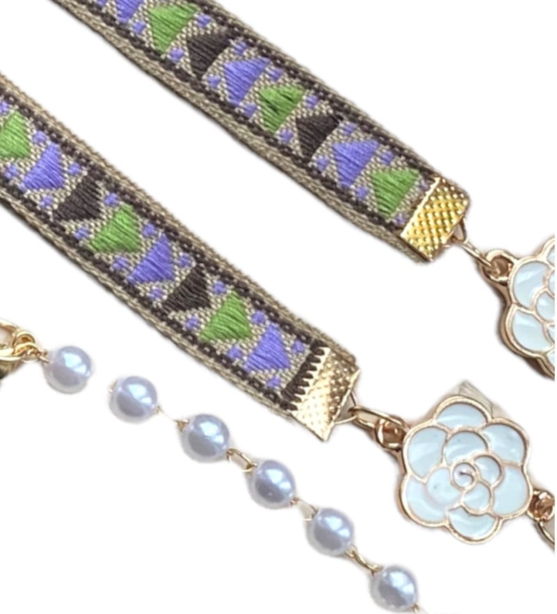 Super trendy en origineel. Dit brillenkoord bestaat uit geweven lint met een hip motief, afgewerkt met een ketting met imitatieparels aan de brilzijde.