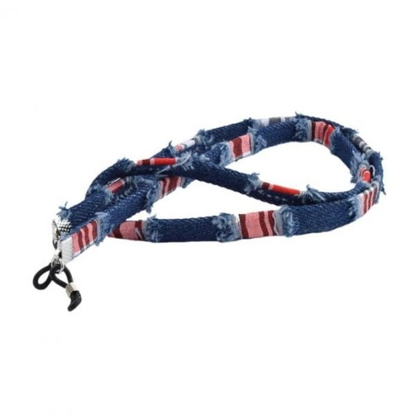 Een zomers brillenkoord met een trendy look. Uitgevoerd in een combinatie van Denim afgewisseld met een halve ruit. Lekker hip met een onvervalste “Torn Look”.