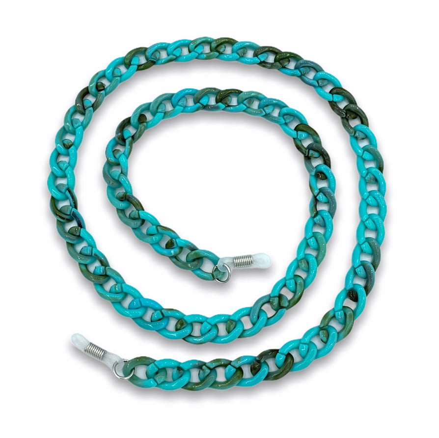 Een prachtige XL brillenketting met ‘”hoog Boho gehalte”. Deze brillenketting met grote schakels is uitgevoerd in een mooie gemarmerde turkoois uitvoering. Een eyecatcher voor het betere terras- en strandwerk.